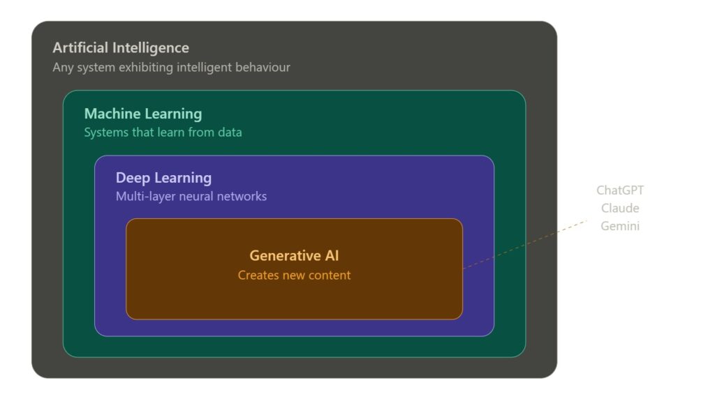 Generative AI does something different. It creates new content: text, images, audio, video, code. It generates outputs that didn’t exist before rather than sorting or predicting from existing categories.